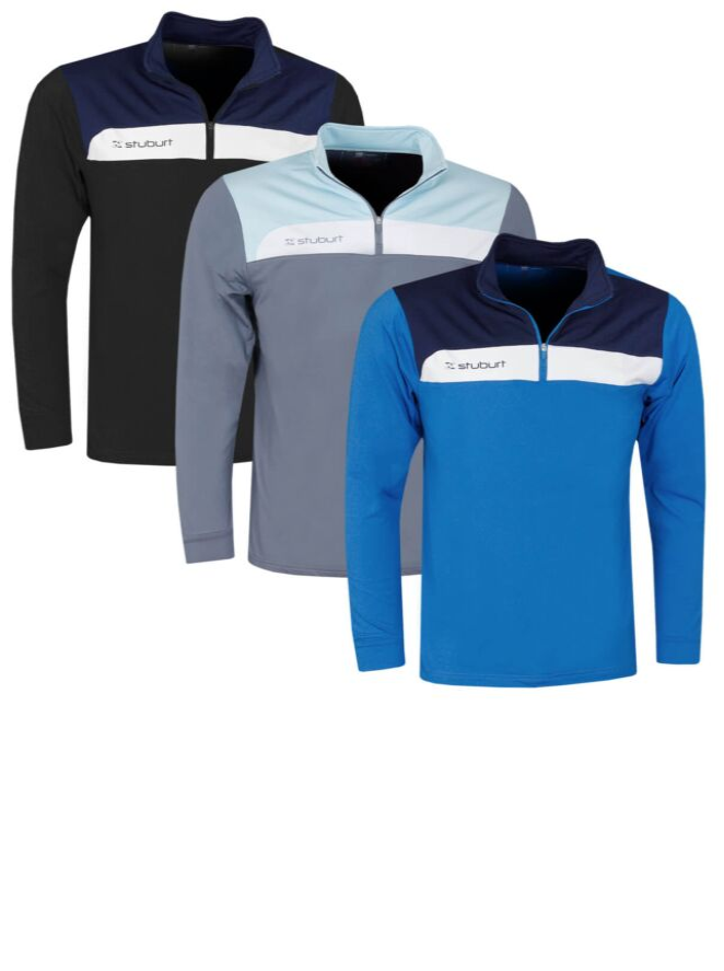 A stylish and versatile half zip mid layer with contemporary colour block stripe design for a sporty look. Offering excellent windproof capability, thermal insulation and high levels of breathability, it is capable of performing in a wide variety of different weather conditions. Constructed from a polyester blend stretch fabric for enhanced freedom of movement and comfort. Featuring Stuburt branding to the right chest.