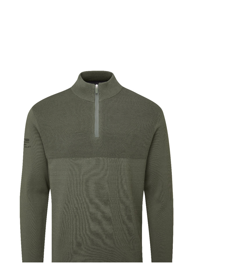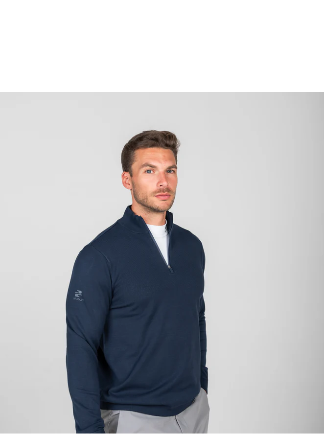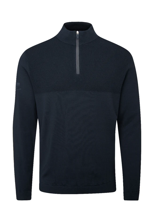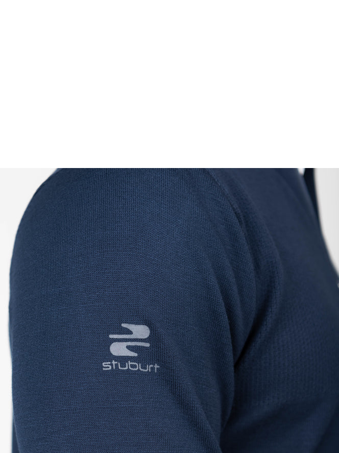 knitwear piece takes a sporty look with reverse waterproof centre zip, rubberized puller and raised texture Stuburt logo to outer back neck.